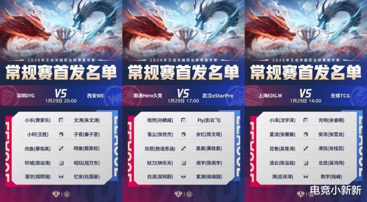 一月二十九日的三场BO5比赛分别是TCG打EDG、eStar打Hero、DYG打WE,TCG和EDG都是三连败零胜的战绩,输家就会变成一组最菜的战队,EDG要是输给TCG这支K甲战队就会贻笑大方。昨天无畏的JDG爆种了,把DRG摁在地上锤,今天Fly也想像无畏那样爆种掀翻三组第三强队Hero。DYG如今形势一片大好,他们只要今天能够击败WE,钎城向鱼就可以重回S组。