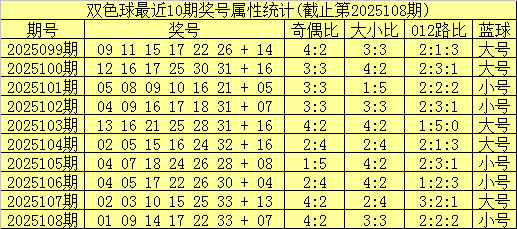 双色球第2025108期开奖号码:01 09 14 17 22 33 + 07。红球大小比为3:3,奇偶比为4:2,012路比为2:2:2,蓝球开出小 号。