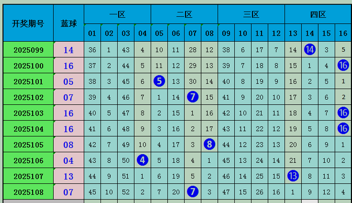 上期蓝球开出号码07,近十期蓝球在一区开1枚,二区开出号码4枚,三区开出0枚,四区开出5枚,区间比1:4:0:5,本期推荐蓝球出现在一区,重点关注03。