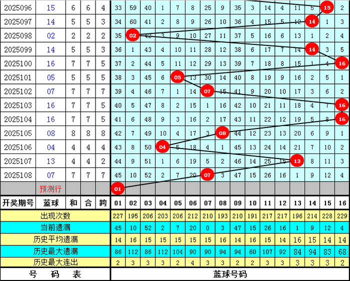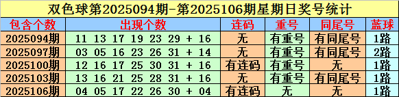 双色球在第2025094期-第2025106期周日开奖中,连码组合出现了2期,开出比例相对较低;重号出现了4期,表现相对较热;同尾号码出现了3次,走势相对较冷。