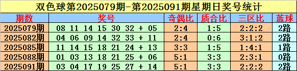 双色球在第2025079期-第2025091期周日开奖中,红球奇偶比累计为17:13,基本持平;红球质合比累计为8:22,质数号码开出相对较少;红球三区比累计为10:12:8,红三区开出比例较低,红二区号码开出频繁。