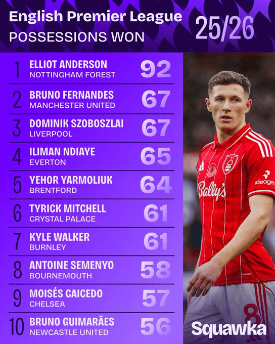 虎扑11月10日讯Squawka统计截至目前英超本赛季夺回球权次数排名。