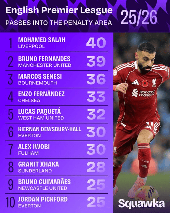 虎扑11月10日讯Squawka统计截至目前英超本赛季传入禁区传球榜。